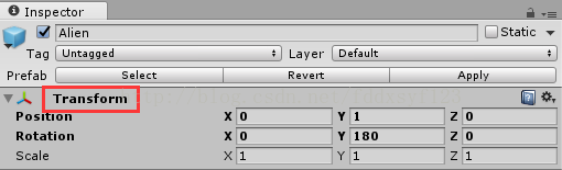 大家熟悉Unity游戏引擎控制gameobject的transform节点,有三大属性可被控制,如图: